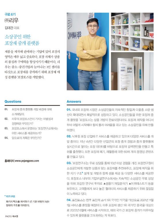 제품을 제작해 판매하는 기업에 있어 포장의 영역은 매우 넓고 중요하다. 포장 자체가 상품의 품질과 구매력을 향상시키기 때문이다. 리우는 중소, 중견기업과 늘어나는 1인 셀러를 타깃으로 포장재를 중개하기 위해 포장재 매칭 플랫폼 '포장포스'를 개발했다. Q01. 포장재 중개 플랫폼 개발 배경에 대해 소개해달라.A01. 국내외 포장재 시장은 소상공인들의 지속적인 창업과 다품종 소량 생산이 확대되면서 폭발적으로 성장하고 있다. 소상공인들을 위한 포장재 중개 플랫폼'포장포스'는 상품 개발이 완료되었더라도 포장재 제작을 어디서부터 어떻게 시작해야 할지 몰라 어려움을 겪고 있는 소상공인을 위해 만들어졌다.Q02. 리우의 포장포스만이 가지는 차별성과 경쟁력은 무엇인가?A02. 낙후된 포장 산업에 IT 서비스를 제공하고 있으며 다양한 서비스를 개발 중이다. 지난 4년간 다양한 산업군의 포장 중개 경험과 중개 플랫폼에 실시간으로 쌓이는 포장 데이터를 바탕으로 포장재 검색엔진을 만들고 특허를 출원했다. 또한 포장재 폐기, 재활용에 대한 60여 개의 동영상 콘텐츠를 만들고 있다.Q03. 포장포스에서 운영하는 '포장연구소'에서는 어떤 서비스를 제공하는가?A03. '포장연구소'는 무료 상담을 통해 10년 이상 경험을 가진 포장연구원이 소상공인에게 개발한 상품과 맞는 포장재를 추천해주고, 포장재 제작을 위한 지기 구조 설계 및 개발과 함께 샘플 제공 등 다양한 서비스를 제공한다. 포장포스 내부의 기업부설연구소에서는 지속적인 소상공인 무료 상담을 위해 과감한 연구비 투자로 샘플기 재질분석기, 이취테스트기 등을 보유하고, 고객들에게 보다 높은 퀄리티의 서비스를 제공하기 위해 끊임없이 노력하고 있다.Q04. 앞으로의 계획은 무엇인가?A04. 포장포스는 향후 포장재 소비 1위 국가인 미국을 대상으로 2021년 11월 1일 서비스를 론칭할 예정이다. 이후 포장재 생산 1위 국가인 중국을 대상으로 2022년 6월에 서비스를 시작하고, 해외 국가 간 포장재 중개가 이루어질 수 있도록 플랫폼을 고도화하는 게 목표다.출처 : IBK 창공