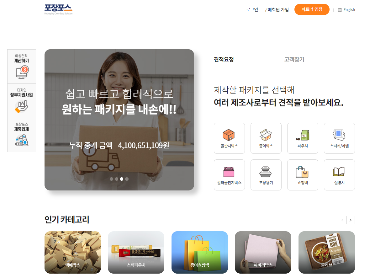 [비욘드포스트 한경아 기자]최근 입점 포장전문회사 100개를 돌파한 포장재 주문제작 플랫폼 서비스 ‘포장포스’가 포장재 디자인이 없어 고민하는 소상공인들을 위해, 포장재 주문제작 견적 요청 시 포장재 디자인 샘플을 무료로 제공한다고 밝혔다.이제 포장재는 단순히 상품을 안전하게 소비자에게 전달하는 보조품이 아니라 브랜드를 소비자에게 한 번 더 각인 시킬 수 있은 마케팅 도구로 진화하고 있다. 특정 포장재만 봐도 어떤 브랜드의 제품인지 알 수는 포장재를 개발하거나 친환경 포장재를 사용하여 브랜드 가치를 올리는 사례가 늘고 있다.하지만 막 창업을 시작한 소상공인의 경우 이런 '특별한' 포장재를 제작하는 것에 어려움을 겪고 있다. 브랜드 고유의 디자인도 없을뿐더러, 포장재 주문제작 경험이 없다면 어디서부터 시작해야 할지 막막한 경우가 많은데, 이런 소상공인의 어려움을 해결해 줄 '포장포스'가 포장재 견적 비교 플랫폼으로 주목받고 있다.포장포스는 포장재를 찾는 소상공인들과 포장전문회사를 중개해 주는 주문제작 플랫폼 서비스로, 포장재에 대해 잘 몰라도 쉽게 제작할 수 있다. 기존처럼 포장재 디자인 업체와 포장재 생산 회사의 비용을 비교하기 위해 일일이 알아보지 않아도 된다는 것이 포장포스의 가장 큰 장점이다. 포장포스를 이용해 포장재를 제작한 다정팜 서동원 전무는 "수박을 담을 포장박스를 어디서부터 어떻게 제작해야 할지 막막했는데, 포장포스를 통해 쉽게 솔루션을 얻을 수 있었다"라면서 "수박이 깨지지 않고 소비자에게 안전하게 배송될 수 있는 포장재 재질 및 구조설계부터, 디자인까지 전문가를 1:1로 매칭해줘 빠르고 쉽게 제작을 할 수 있었다"라고 말했다.포장포스에는 10년 이상 된 포장재 전문 포장 매니저가 쉽게 견적 요청을 할 수 있도록 실시간으로 상담을 해주며 다양한 샘플을 무료로 제공하고 있다.포장매니저와 컨설팅 후 원하는 포장재 형태와 구매 수량(MOQ) 및 규격 등 제작에 필요한 기본 정보만 기재해 견적을 요청하면 포장포스에 입점된 포장 전문 회사들이 해당 견적서를 보고 입찰을 진행하게 된다. 소비자는 이 중 마음에 드는 조건의 회사와 거래를 진행하면 된다.포장포스에는 현재 100여 개의 포장 전문 회사들이 협력사로 등록되어 있기 때문에 발품을 팔지 않아도 쉽게 경쟁 입찰을 통해 저렴한 견적을 받아볼 수 있다. 이처럼 포장재 제작이 처음인 소상공인도 빠르고 간편하게 포장재 가격을 비교하고 디자인 서비스까지 무료로 받아볼 수 있어 제작 비용과 시간을 아낄 수 있기 때문에 만족도가 높다.포장포스 담당자는 "포장포스는 소상공인들이 보다 쉽고 편리하게 특별한 포장재를 제작해 상품 경쟁력을 갖출 수 있는 환경을 제공하고 싶다"면서 "앞으로도 더 높은 편리성과 합리적인 가격 서비스로 고객에게 최선을 다하겠다”라고 전했다.news@beyondpost.co.kr